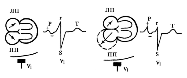 В норме в грудном отведении V1 зубец Р в большинстве случаев двухфазный (+/-). Его первая, положительная, фаза обусловлена возбуждением ПП, а вторая, отрицательная, — возбуждением ЛП. Это обусловлено тем, что при возбуждении ПП вектор возбуждения направлен в сторону положительного электрода данного отведения, а при возбуждении ЛП к отрицательному. При этом ширина и амплитуда обеих фаз зубца одинакова.