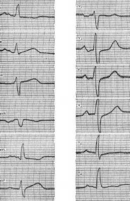 В редких случаях значительное увеличение левого желудочка ведет к выраженному повороту сердца вокруг продольной оси правым желудочком вперед и влево. Левый желудочек при этом оказывается сзади. При таком повороте в правых грудных отведениях регистрируются желудочковые комплексы типа QS, а в левых грудных отведениях - с преобладающим зубцом S. Появлению такой электрокардиографической картины способствует также блокада левой передней ветви.