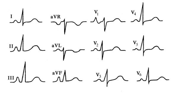 Комплекс QRS в отведениях I и aVL обычно имеет форму rS, а в отведениях III и aVF - qR. При повороте сердца верхушкой кзади выявляется глубокий, иногда преобладающий, зубец S в отведениях I, II и III (так называемый 5-тип, или «синдром трех S»).