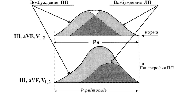При гипертрофии ПП увеличивается вектор возбуждения этого отдела сердца, что приводит к увеличению амплитуды и продолжительности первого компонента зубца Р. Вторая часть зубца Р, связанная с возбуждением ЛП, не изменена по сравнению с нормой. В результате сложения векторов возбуждения правого и ЛП образуется единый остроконечный зубец Р, который обычно называют «Р-pulmonale». При этом общая длительность (ширина зубца Р) возбуждения предсердий не превышает нормальных значений.