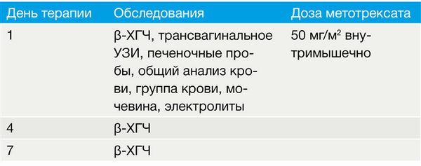 Повторные ультразвуковые исследования, особенно когда, несмотря на лечение, хорионический гонадотропин все еще определяется, что может занять месяц или больше. Метотрексат чаще всего вводят в дозе 50 мг / м2 площади. тело за один укол. После первоначального повышения уровень бета-ХГЧ должен снизиться с седьмого дня после приема. При отсутствии снижения уровня бета-ХГЧ на 15% в период между 4 и 7 днями после приема пациенту требуется хирургическое лечение или введение второй дозы метотрексата, если нет противопоказаний, и, возможно, в дальнейшем, пока концентрация бета-ХГЧ не снижается.