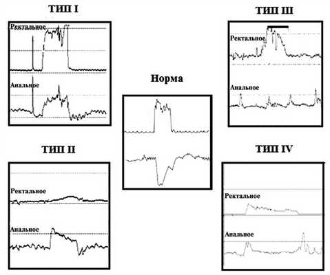 Причиной первичных функциональных ХЗ у 44,8% больных служит нарушение функции (диссинергия) мышц тазового дна. Преобладают нарушения I типа (64,4%) — парадоксальное повышение давления в области АС при удовлетворительном повышении пропульсивного давления и II типа (32,2%) — неудовлетворительное формирование пропульсивного давления при парадоксальным повышении давления в области АС.
