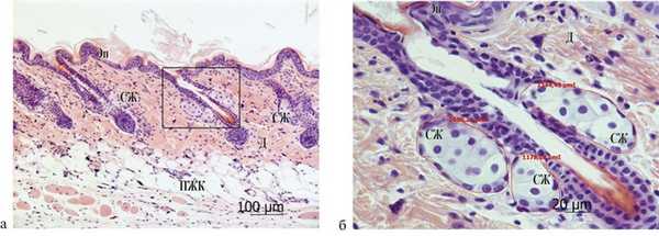 Животных выводили из эксперимента на следующий день после окончания аппликаций путем дислокации шейных позвонков. Фрагменты кожи спины (у опытных животных из зоны нанесения препарата) фиксировали в расправленном состоянии в 10% забуференном формалине, дегидратировали в спиртах возрастающей концентрации и заливали в смесь Histomix («Биовитрум», Россия). Срезы окрашивали гематоксилином и эозином и изучали под световым микроскопом Axioskop 2 («Carl Zeiss», Германия). Число профилей ацинусов СЖ подсчитывали при использовании объектива с 40-кратным увеличением в 20 полях зрения подряд от каждого животного. Микрофотографирование и определение площади сечений секреторных отделов СЖ проводили на аппаратно-программном комплексе, включающем микроскоп Axioskop 2, камеру AxioCam и систему формирования изображения AxioVision («Carl Zeiss», Германия). У каждого животного определяли площади 30 расположенных подряд профилей ацинусов.
