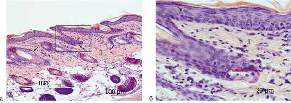 Эпидермис кожи контрольных мышей в высоту насчитывает от базальной мембраны до зернистого слоя 2—3 клетки, образует кнаружи небольшие выступы. Эпидермальные гребешки и сосочки отсутствуют. Зернистый слой тонкий состоит из 1—2 слоев плоских кератиноцитов с базофильными гранулами кератогиалина в цитоплазме. Роговой слой представлен узкой, прилежащей к клеточному эпидермису, пластиной компактного кератина, над которым располагаются рыхлые кератиновые пласты. Сально-волосяные комплексы расположены равномерно, содержат относительно крупные профили СЖ (рис. 1, а, б). Дерма представлена коллагеновыми и эластическими волокнами с диффузно расположенными резидентными клетками: зрелыми фибробластами, немногочисленными макрофагами, лимфоцитами, тучными клетками.
