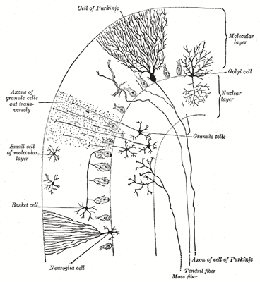 Мозжечок имеет относительно простую архитектуру: трехслойная мозжечковая кора (молекулярная, клеточная и зернистая), корпускулярная оболочка (белое вещество) и глубокие ядра (фастигмические, шаровидные и эмболические и зубчатые ядра). Он имеет пять типов нейронов. Четыре являются ингибирующими ГАМКергическими нейронами (Purkinje, Golgi, клетками корзинчатых и звездчатых клеток), а один представляет собой возбуждающий глутаматергический нейрон (клетки гранулы).