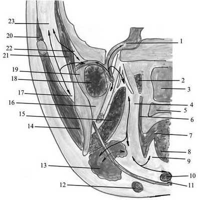 Распространение гнойно-воспалительных процессов из межфасциальных щелей шеи определяется особенностями строения фасций и клетчаточных пространств. Гнойно-воспалительный процесс, локализованный между листками поверхностной фасции, может распространяться вниз в фасциальную капсулу молочной железы. Гнойно-воспалительный процесс, локализованный между поверхностной и собственной фасциями, книзу может распространяться на переднюю поверхность грудной клетки в ретромаммарное пространство.