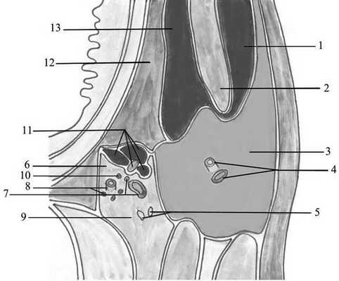 В межкрыловидном клетчаточном пространстве содержится n.mandibu-laris и его ветви, челюстная артерия и ее ветви, венозное крыловидное сплетение. Межкрыловидное клетчаточное пространство связано (рис. 1, рис. 2): через жировой комок Биша — с клетчаткой щеки, крылонебной ямкой, с подапоневротической клетчаткой височной области; по ходу челюстной артерии — с ложем околоушной железы; через овальное и остистое отверстия — со средней черепной ямкой; через слабое место в передневерхнем углу межкрыловидной фасции, где ее прободает n.tensoris veli palatini, с передним отделом
