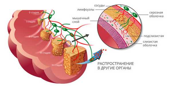 Рак ободочной кишки может распространяться в другие органы разными способами: