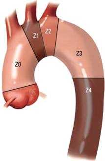 Для планирования различных видов эндопротезирований при расслоении аорты Mitchell с соавт. разработали специальную анатомическую классификацию, на основании которой дуга аорты, а также ее восходящий и нисходящий отделы разделяются на зоны, в пределах которых осуществляется фиксация стент-графта (см. рис. 1) [28]. Данная классификация в последнее время завоевала широкое распространение во всем мире, и активно используется при планировании гибридных вмешательств.