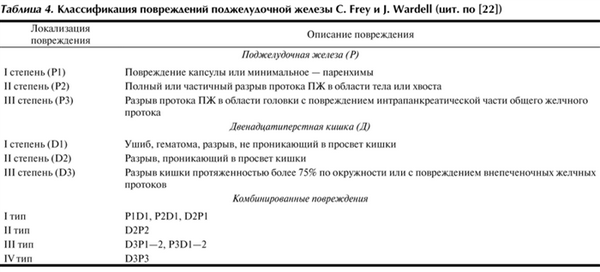 Таблица 4. Классификация повреждений поджелудочной железы C. Frey и J. Wardell (цит. по [22])
