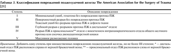В классификацию А.К. Ерамишанцева и А.Б. Молитвословова [23] включены ушиб ПЖ с образованием ненапряженной подкапсульной гематомы без повреждения капсулы; разрыв ПЖ или ее размозжение без повреждения главного панкреатического протока; разрыв ПЖ или ее размозжение с повреждением главного панкреатического протока; сочетанное панкреатодуоденальное повреждение.