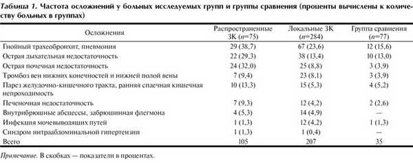Частота осложнений у пострадавших исследуемых групп и группы сравнения приведена в табл. 1. При ЗК наиболее часто развиваются гнойный трахеобронхит и пневмония, острая дыхательная и острая почечная недостаточность, другие осложнения диагностировались реже.