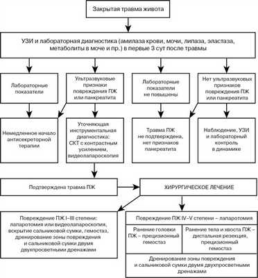С учетом выявленных особенностей клинического течения травматического панкреатита в зависимости от степени тяжести повреждения ПЖ, вида хирургического вмешательства и срока начала проведения консервативной терапии был разработан и с 2002 г. внедрен в клиническую практику алгоритм лечебно-диагностической тактики оказания помощи пострадавшим с подозрением на повреждение ПЖ при закрытой травме живота (рис. 4).