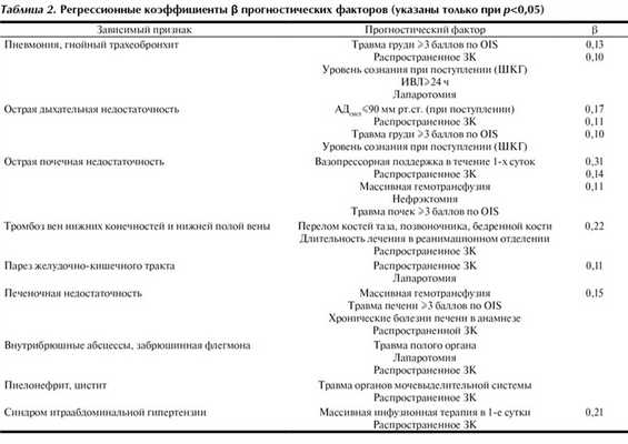 Прогностические факторы и регрессионные коэффициенты для них приведены в табл. 2. Развитию пневмонии способствуют два фактора: тяжелая травма грудной клетки (≥III степени по OIS) и распространенное ЗК. Обнаруженная зависимость имеет патогенетическое объяснение. С одной стороны, развитию пневмонии способствует нарушение каркасной функции грудной клетки при переломах ребер и тяжелая травма легких, с другой - распространенное ЗК приводит к парезу желудочно-кишечного тракта, а он, в свою очередь, к нарушению функции диафрагмы и ателектазам базальных отделов легких. Эти же факторы делают более вероятным развитие острой дыхательной недостаточности, чему также способствует травматический шок, который приводит к респираторному дистресс-синдрому. Наиболее значимой причиной острой почечной недостаточности является вазопрессорная поддержка в течение первых суток после поступления. Объяснением этому является снижение почечного кровотока при применении вазопрессоров. Дополнительными причинами острой почечной недостаточности являются распространенное ЗК (по-видимому, за счет всасывания продуктов ее распада) и массивная гемотрансфузия, влияние которой на функцию почек хорошо известно. К тромбозам нижней полой вены и ее притоков приводят переломы костей таза, позвоночника и бедренной кости. Причиной тромбозов у этих пациентов скорее всего является длительная гиподинамия. Распространенность ЗК не оказывает существенного влияния на развитие тромбоза вен нижних конечностей и нижней полой вены. Парез желудочно-кишечного тракта возникает у больных с распространенным ЗК, что можно объяснить вовлечением в патологический процесс корня брыжейки тонкой кишки. Фактором риска печеночной недостаточности является массивная гемотрансфузия, однако распространенность ЗК не влияет на развитие этого осложнения. У больных исследуемых групп не удалось определить причины развития абдоминальных гнойных осложнений и инфекций мочевыводящей системы, таких как пиелонефрит и цистит. Синдром интраабдоминальной гипертензии чаще развивается у больных, которым в первые сутки проводили массивную инфузионную терапию, однако распространенность ЗК на него не влияет.