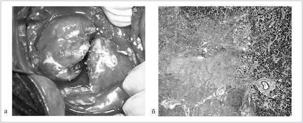 С этой целью было проведено морфологическое изучение препаратов ПЖ у 22 пострадавших, умерших в ранние сроки после травмы. Оно показало, что, независимо от характера и степени травмы, во всех этих наблюдениях развивался травматический панкреатит с поражением всех отделов П.Ж. При интраоперационной ревизии уже через 6—10 ч после закрытой травмы наблюдалось формирование очагов некроза не только по линии разрыва, но и на расстоянии от нее (рис. 1, а). При микроскопическом исследовании в зоне повреждения, как правило, отмечался крупноочаговый панкреонекроз, на расстоянии от очага поражения — мелкоочаговые некрозы ткани ПЖ (см. рис. 1, б).
