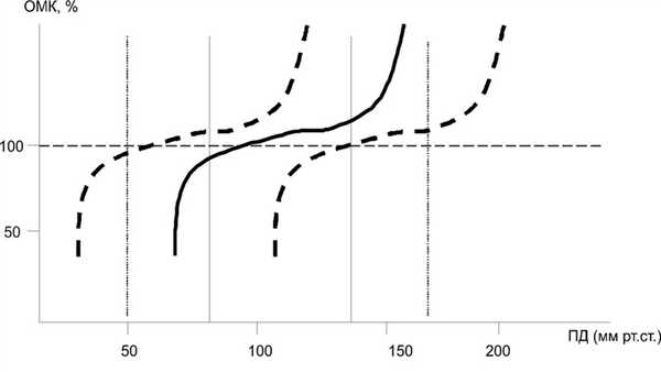 При атеросклеротическом поражении может возникать дискоординация тонуса сосудов головного мозга с изменением параметров ауторегуляции (рис. 2). Рисунок 2. Зависимость объемного мозгового кровотока (ОМК) от величины перфузионного давления (ПД) при различных патологических состояниях. Объяснение в тексте. Оперативные вмешательства, выполняемые у таких больных на сосудах головного мозга и артериях других органов (коронарные, почечные, аорта, артерии нижних конечностей), могут приводить к колебаниям перфузионного давления не только во время операции, но и в послеоперационном периоде с возможностью возникновения гемодинамического нарушения мозгового кровообращения. В связи с этим существует потребность правильной оценки возможностей АМК в предоперационном периоде, что может позволить своевременно провести терапию, направленную на нормализацию активности мозгового кровотока.