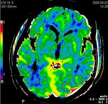 Пример: карта объема мозгового кровотока, с указанием показателей повышения плотности вещества головного мозга во время прохождения быстрого болюса контрастного вещества.