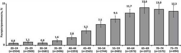 Рис. 2. Распространенность СД-2 в зависимости от возраста (по данным исследования NATION).