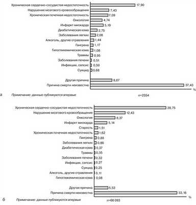 Рис. 3. Структура смертности пациентов с СД-1 (а) и СД-2 (б) по данным Государственного регистра СД в 63 регионах РФ (по состоянию на 31.01.2015).