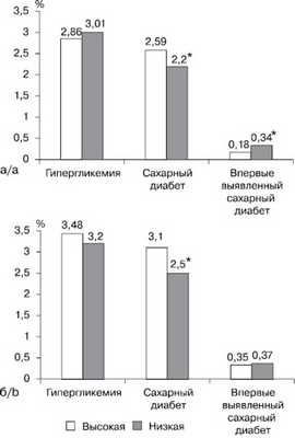 В связи со значительными гендерными различиями в показателях смертности от ССЗ был осуществлен сравнительный анализ данных, полученных при диспансеризации в 2017 г. в 10 регионах с высокой и низкой сердечно-сосудистой смертностью, для мужчин и женщин раздельно (рис. 3). Сравнительная оценка частоты гипергликемии, СД и впервые выявленного СД у мужчин и женщин в 10 субъектах РФ с наибольшей и наименьшей сердечно-сосудистой смертностью (%) показала, что в субъектах РФ с наибольшей смертностью реже регистрировалась гипергликемия у мужчин — 8664 из 302 134 (2,86%), чаще отмечалась у женщин — 12 827 из 368 287 (3,48%) пациентов по сравнению с регионами с наименьшей сердечно-сосудистой смертностью: 40 991 (3,01%) из 1 329 434 мужчин и 35 085 (3,2%) из 1 095 126 женщин (р>0,05 для обоих случаев) (см. рис. 3).