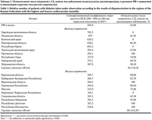 Таблица 3. Относительное число пациентов с СД, взятых под наблюдение по результатам диспансеризации, в регионах РФ с наивысшей и наименьшей сердечно-сосудистой смертностью