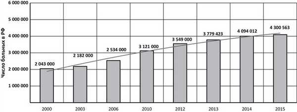 Ситуация в России по эпидемиологическим показателям распространенности СД и смертности от осложнений не отличается от таковой в экономически развитых странах. По данным Государственного регистра больных СД, численность больных СД в России за последние 15 лет по обращаемости увеличилась в 2 раза (с 2 млн в 2000 г. до более 4 млн в 2015 г.) [3,4] (рис. 1).