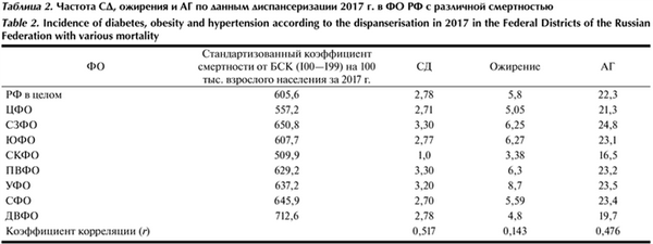 Таблица 2. Частота СД, ожирения и АГ по данным диспансеризации 2017 г. в ФО РФ с различной смертностью