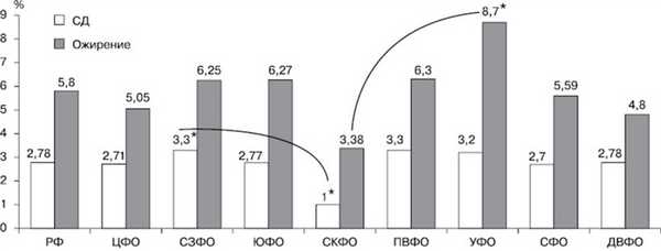 Рис. 2. Частота СД и ожирения в ФО РФ по данным диспансеризации 2017 г.