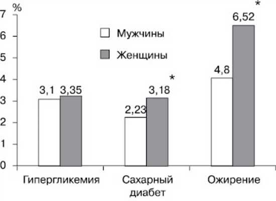 Гендерные различия во всех случаях демонстрировали большую выявляемость всех показателей ФР и заболеваний у женщин (см. табл. 1), однако были статистически достоверны только в случаях наличия ожирения (4,8% у мужчин против 6,52% у женщин, р<0,001) и СД (2,23% у мужчин против 3,18% у женщин, р<0,001) (рис. 1).