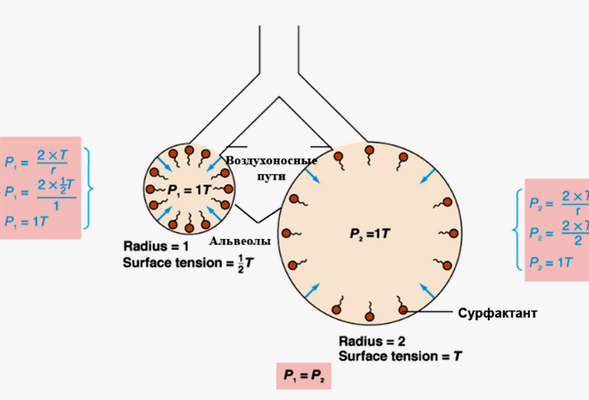 Важным фактором, влияющим на эластические свойства и растяжимость легких, является поверхностное натяжение жидкости в альвеолах. Спадению альвеол препятствует антиателектатический фактор, или сурфактант, выстилающий внутреннюю поверхность альвеол, препятствующий их спадению, а также выходу жидкости на поверхность альвеол из плазмы капилляров легкого. На любой поверхности раздела между воздухом и жидкостью действуют силы межмолекулярного сцепления, стремящиеся уменьшить величину этой поверхности (силы поверхностного натяжения). Под влиянием этих сил альвеолы стремятся сократиться. Поверхностное натяжение альвеол в 10 раз меньше теоретически рассчитанного натяжения для соответствующей водной поверхности.