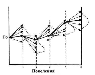 Мутационный процесс протекает в целом очень медленно и, соответственно, обусловливает медленную перестройку генетической структуры популяции. Наряду с мутациями на генетическую структуру популяции оказывают влияние другие процессы, в том числе дрейф генов (рис. 144). Дрейф генов - это изменение частоты генов в популяции в ряду поколений под действием случайных (стохастических) факторов. Он приводит, как правило, к снижению наследственной изменчивости популяций. Термин «дрейф генов» введён в 40-х годах ХХ века американским генетиком С. Райтом (1889-1982). Независимо от него Д.Д. Ромашов (1899-1963) и Н.П. Дубинин (1907-1998) описали это явление под названием «генетико-автоматический процесс». Дрейф генов проявляется наиболее отчётливо при резком сокращении численности популяции в результате стихийных бедствий (лесной пожар, наводнение), массового распространения вредителей и т.д.