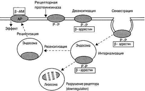 Чувствительность рецепторов к агонистам и количество рецепторов постоянно меняются. Так, после стимуляции β1-адренорецепторов агонистом β1-адренорецепторы фосфорилируются специальной рецепторной киназой, соединяются с белком β-аррестином и в этом комплексе теряют способность взаимодействовать с G-белками (десенситизация рецепторов). Комплекс β1-адренорецепторы с β-аррестином поглощается клеткой путём эндоцитоза (интернализация рецепторов) и захватывается эндосомами и лизосомами. В эндосомах молекулы β1-аррестина отсоединяются от рецепторов, которые вновь встраиваются в клеточную мембрану; чувствительность рецепторов к агонистам восстанавливается (ресенситизация рецепторов). В лизосомах происходит разрушение молекул рецепторов (down-regulation) (рис. 14).