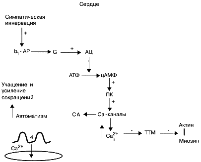 Рис. 10. Механизм учащения и усиления сокращений сердца при стимуляции β1-адренорецепторов. АЦ - аденилатциклаза; ПК - протеинкиназа; СА - синоатриальный узел; ТТМ - тропонин-тропомиозин.