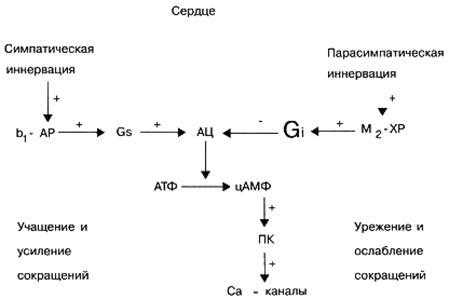 Одними из первых были обнаружены G-белки, связанные с β1- адренорецепторами сердца. При активации симпатической иннервации сердца возбуждаются β1-адренорецепторы; через посредство G-белков активируется аденилатциклаза; из АТФ образуется цАМФ, активируется протеинкиназа, при действии которой фосфорилируются и открываются Са 2+ -каналы.