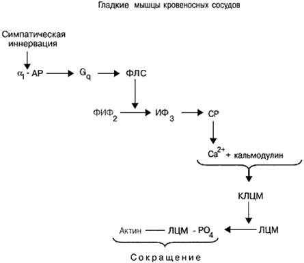 Рис. 13. Механизм сокращения гладких мышц кровеносных сосудов при стимуляции симпатической иннервации. ФЛС - фосфолипаза С; ФИФ2 - фосфатидилинозитол-4,5-дифосфат; ИФ3 - инозитол-1,4,5-трифосфат; СР - саркоплазматический ретикулум; КЛЦМ - киназа лёгких цепей миозина.