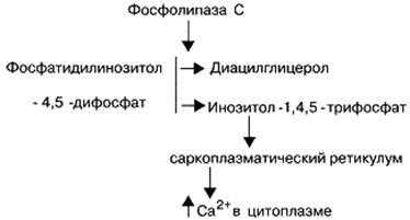 При возбуждении M1-холинорецепторов, М3-холинорецепторов, α1-адренорецепторов через Gq-белки активируется фосфолипаза С, которая способствует тому, что из фосфатидилинозитол-4,5-дифосфата образуются инозитол-1,4,5-трифосфат и диацилглицерол.
