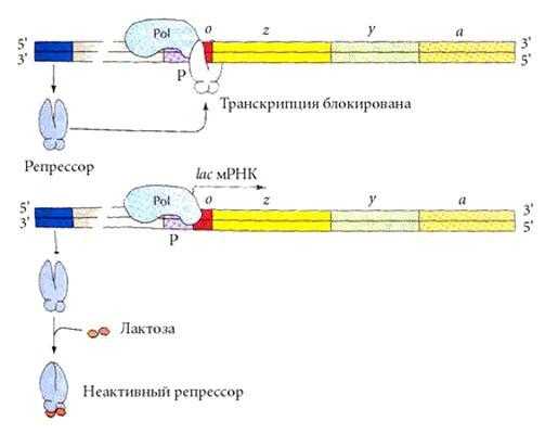 Интенсивность транскрипции определяется промотором, который распознается ферментом РНК-полимеразой и указывает место, где должна начинаться транскрипция. Перед группой структурных генов находятся общий для них промотор и общийоператор.Интенсивность транскрипции регулируется в результате взаимодействия оператора сбелком-репрессором, который, присоединяясь к оператору, блокирует транскрипцию. В зависимости от ситуации в клетке репрессор закрывает или открывает оператор и начинается транскрипция гена.