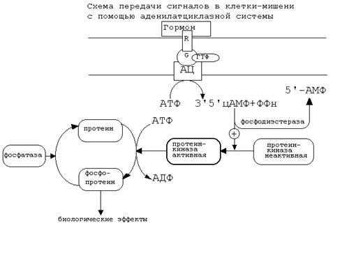 ц-АМФ обладает способностью активировать особые ферменты - протеинкиназы, которые катализируют реакции фосфорилирования различных белков с участием АТФ. При этом в состав белковых молекул включаются остатки фосфорной кислоты. Главным результатом этого процесса фосфорилирования является изменение активности фосфорилированного белка. В результате реакции фосфорилирования белки могут становятся функционально активными или неактивными.