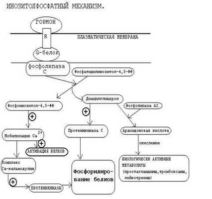 Известно, что образование диацилглицерина и инозитолтрифосфата приводит к увеличению концентрации ионизированного кальция внутри клетки. Это приводит к активации многих кальций-зависимых белков внутри клетки, в том числе активируются различные протеинкиназы. И здесь, как и при активации аденилатциклазной системы, одной из стадий передачи сигнала внутри клетки является фосфорилирование белков, которое в приводит к физиологическому ответу клетки на действие гормона.