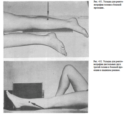 Укладка больного для выполнения снимка. Больной лежит на боку. Голень исследуемой конечности латеральной стороной помещают на кассету. При укладке больного нужно учитывать то, что толщина мягких тканей по передней и по задней поверхности голени неодинакова: в области икроножной мышцы она намного больше. Поэтому кости голени проецируются значительно ближе к передней поверхности, чем к задней. Пучок рентгеновского излучения направляют отвесно, в центр кассеты (рис. 431).