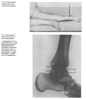 Область голеностопного сустава латеральной поверхностью расположена на кассете. Стопу укладывают так, чтобы пятка плотно прилегала к кассете, что обеспечивает поворот стопы внутрь на 15 — 20°. Проекция суставной щели голеностопного сустава соответствует средней линии кассеты. Противоположная конечность согнута в коленном и тазобедренном суставах, перекинута вперед; бедро слегка приведено к животу. Пучок рентгеновского излучения направляют отвесно в центр кассеты через внутреннюю лодыжку (рис. 439).