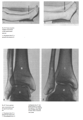 2. Снимок голеностопного сустава в прямой задней проекции с ротацией стопы. Укладка отличается от предыдущей положением стопы, которую вместе с голенью ротируют на 15 — 20° кнутри. Положение больного, кассеты и центрация пучка рентгеновского излучения такие же, как и при укладке для снимка голеностопного сустава без ротации стопы