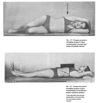 Центральный пучок рентгеновского излучения направляют отвесно на середину дуги позвоночника, что соответствует точке, расположенной по задней подмышечной линии на уровне нижнего угла лопатки. Фокусное расстояние—100 см (рис. 231).
