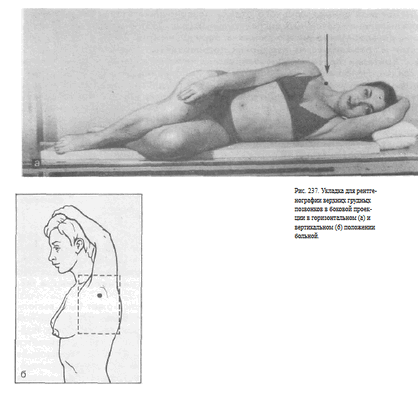 Пучок рентгеновского излучения направляют в горизонтальной плоскости, центрируя на середину подмышечной ямки. Фокусное расстояние —100 см (рис. 238).