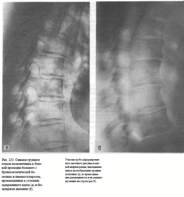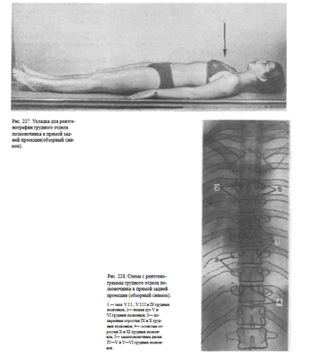 Нижние 2 или 3 позвонка видны обычно не достаточно отчетливо, так как их изображение перекрывается массивными плотными тенями органов брюшной полости. При наличии выраженного кифоза грудного отдела позвоночника верхние и нижние грудные позвонки подвергаются значительным проекционным искажениям, их тела проекционно наслаиваются друг на друга,