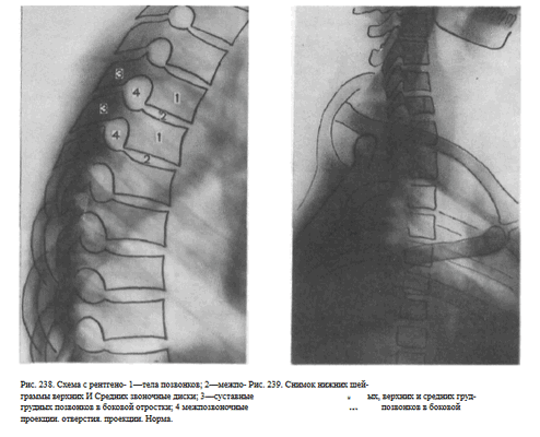 Информативность снимка. Снимок дает четкое представление о состоянии верхних грудных позвонков. На снимке хорошо видны тела этих позвонков, межпозвоночные диски, межпозвоночные отверстия и суставные отростки. Легочный рисунок обычно менее выражен в верхних легочных отделах и, как правило, не мешает выявлению костной структуры позвонков (рис. 239, а, б).