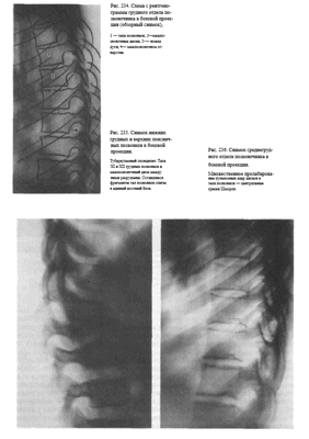 Информативность снимка. На снимке хорошо видны тела грудных позвонков в виде прямоугольников, начиная с IV и до X или XI грудных позвонков. Один или два нижних грудных позвонка обычно видны плохо, так как на них проекционно наслаивается интенсивная тень печени. Для четкого выявления этих позвонков нужно производить съемку при тех же технических условиях, что и съемку поясничных позвонков. Хорошо видны межпозвоночные диски в виде нешироких полос просветления между телами позвонков. Видны также ножки дуг, межпозвоночные отверстия и межпозвоночные суставы (дугоотростчатые соединения) (рис. 234)