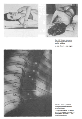 Информативность снимка. На снимке выявляются тела средних и нижних грудных позвонков и суставные отростки, образующие межпозвоночные суставы на стороне, обращенной в сторону трубки. На этой же стороне видны поперечные отростки, а также головки и шейки ребер (рис. 241).