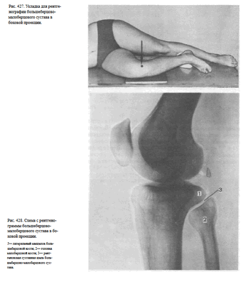 Рентгенологическое исследование коленного сустава в прямой проекции обязательно дополняется боковым снимком. При боковой рентгенографии центральный луч проходит по суставной щели с уклоном на 10° в каудо-краниальном направлении. При этом края мыщелков бедренной кости накладываются друг на друга и их суставные поверхности смещаются в своей задней нижней части. Это позволяет хорошо различать их контуры и оценить состояние бедренно-надколенникового сочленения.