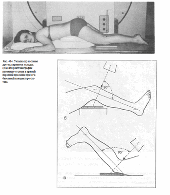 Эти укладки полезны для изучения межмыщелкового пространства, которое в этом положении оказывается максимально доступным обзору. Они позволяют выявлять свободные инородные тела в полости сустава, образуемые в результате повреждения суставных хрящей.